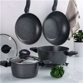 La linea Orion tiene retención y rápida distribución del calor. Adecuado para cocinas domésticas y profesionales. Fabricado en aluminio forjado, ligero y muy resistente. Revestimiento de mármol + para una cocción y limpieza eficientes. Fondo de inducción de puntos. Mango de serpiente gris suave al tacto con inserto cromado. El grosor óptimo permite una excelente retención de calor.