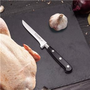 El cuchillo para deshuesar Forge es ideal para desprender la carne del hueso. Con hoja delgada y una curvatura característica de los cuchillos de deshuesar. La colección Forgé son cuchillos forjados en una única pieza de acero inoxidable de alta calidad, con un filo duradero y mango de POM. Cuchillos profesionales con una perfecta combinación entre la suavidad en el manejo y la precisión en los cortes.