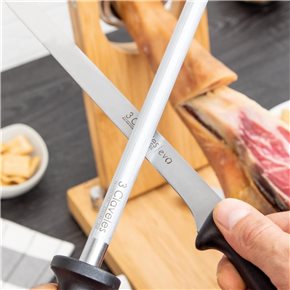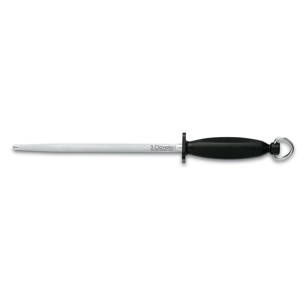 La Chaira Redonda de 3 Claveles está fabricada en cromo duro, un material de alta resistencia ideal para asentar el filo del cuchillo y facilitar un corte preciso en cada uso. Como usarla: 1 Mantén el cuchillo en un ángulo de aproximadamente 20º sobre la chaira. 2 Desliza la hoja describiendo un arco, desde el mango hasta la punta. 3 Alterna ambos lados del filo en movimientos uniformes y constantes. 4 Evita golpear la hoja contra el protector o la propia chaira para no dañar el filo.