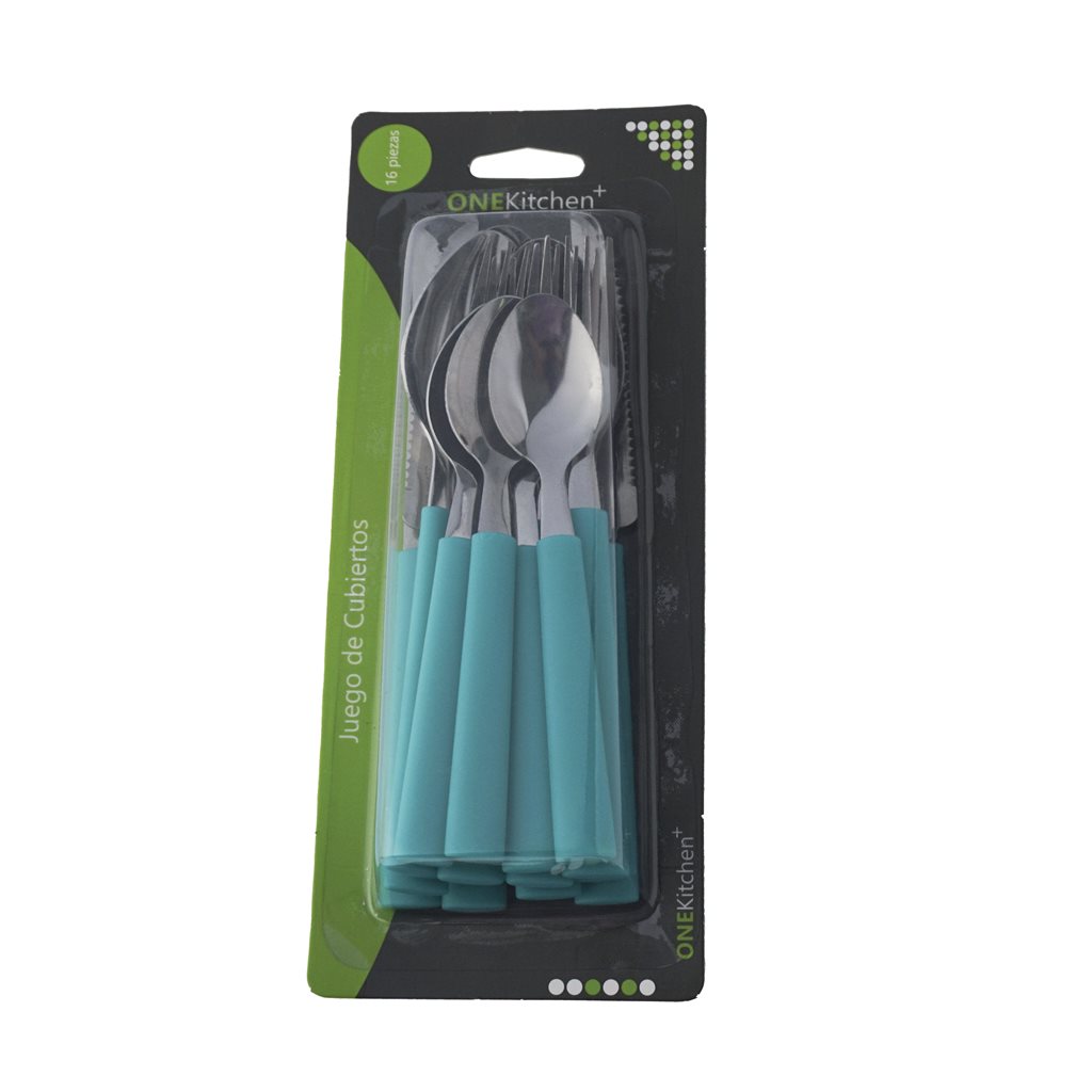 JUEGO DE CUBIERTOS 16 PIEZAS MANGO PLASTICO TURQUESA